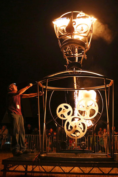 4 metre high head and shoulders form with working ice gear wheels and fire, originally produced with the aid of an Arts Council England grant for the Deer shed Festival in Thirsk. This piece has now been performed in many locations in the UK and also in Hannover, Germany. see;