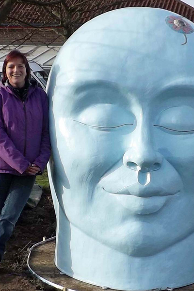 2 metre high head (with a seat inside for two people) including 100’s of small ceramics and mosaics made with service users and staff at Fieldhead Hospital, Wakefield.
